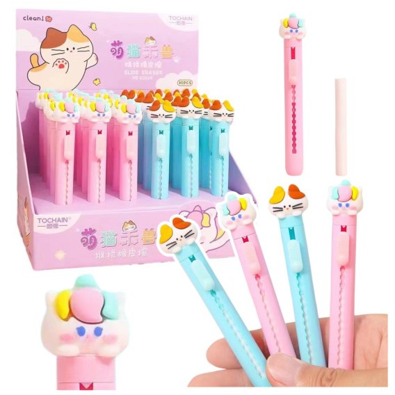 Wysuwana gumka do mazania z uroczą figurką kotka to praktyczny i estetyczny dodatek do szkolnego zestawu każdego dziecka. Pastelowe kolory, zabawna forma i miękka gumka zatopiona w piasku sprawiają, że produkt jest nie tylko funkcjonalny, ale i atrakcyjny wizualnie. Ergonomiczna obudowa umożliwia łatwe wysuwanie gumki za pomocą suwaka i chroni ją przed zabrudzeniem.