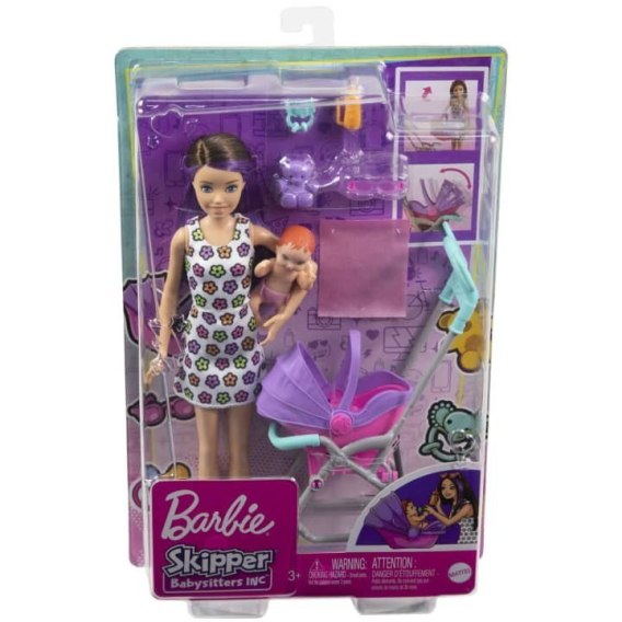 Zestawy do zabawy z linii Barbie Skipper Klub Opiekunek pozwalają dzieciom rozwijać zmysł opiekuńczości. Dzięki temu wyjątkowemu zestawowi dzieci mogą pomóc niani Skipper w opiece nad bobaskiem, przewożąc go w spacerówce, która kołysze się podczas popychania. Dzięki akcesoriom, takim jak miś "przytulanka", butelka, grzechotka i kocyk dla dziecka, lalka opiekunka ma wszystko, czego potrzebuje, aby dobrze opiekować się maluszkiem. Dzieci od 3 roku życia mogą zebrać też inne lalki i akcesoria Barbie Klub Opiekunek, aby odkrywać radość z bycia nianią. Sprzedawane oddzielnie, zależnie od dostępności. Lalki nie stoją samodzielnie. Kolory i elementy dekoracyjne mogą się różnić.