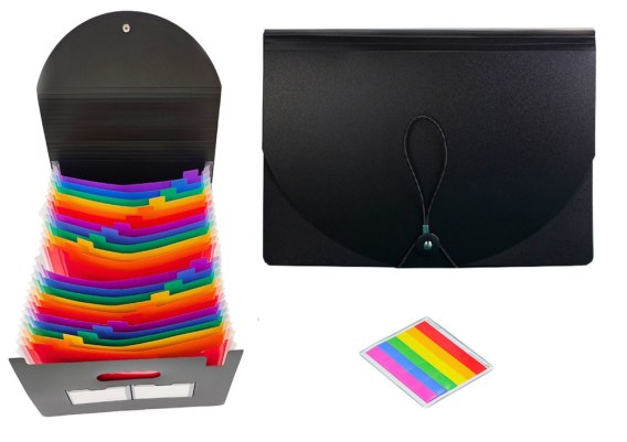 Teczka zawiera aż 24 kieszenie na dokumenty A4, z każdą kieszenią w innym kolorze, co umożliwia łatwe i szybkie sortowanie oraz dostęp do dokumentów.