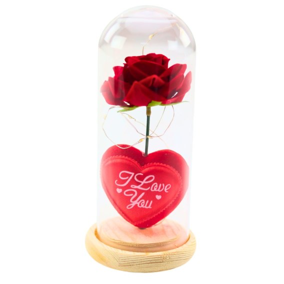 Wieczna Róża w Kopule z Oświetleniem LED Czerwona z Serduszkiem 18,5x8cm