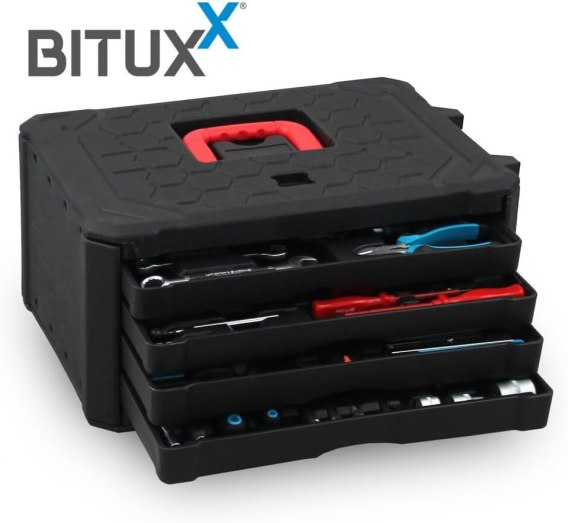 - Wózek narzędziowy z wymiennymi szufladami i praktycznym uchwytem do przenoszenia,