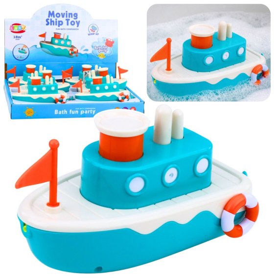 Statek jest nakręcany, a po wprawieniu w ruch samodzielnie pływa po wodzie, co przyciąga uwagę dziecka i zachęca do aktywnej zabawy. Dodatkową atrakcją jest przycisk umieszczony na górze zabawki, który po naciśnięciu chlapie wodą, dostarczając jeszcze więcej radości i śmiechu. Takie rozwiązanie sprawia, że zabawka angażuje dziecko na dłużej i urozmaica każdą kąpiel.