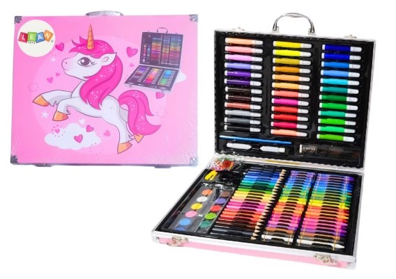 Zestaw artystyczny 150 elementów w różowej walizce z motywem jednorożca zawiera wszystko, czego potrzebuje mały artysta: kredki ołówkowe, pastele, piaski dwustronne, farby, dwa pędzelki, gumkę i strugaczkę. Idealny do rozwijania kreatywności i wyobraźni.